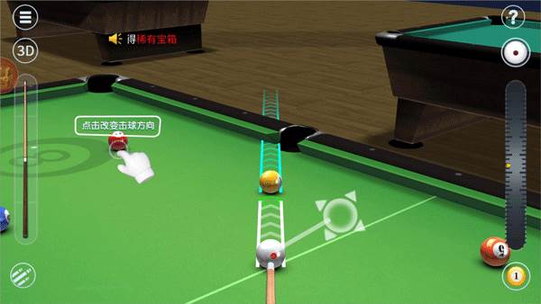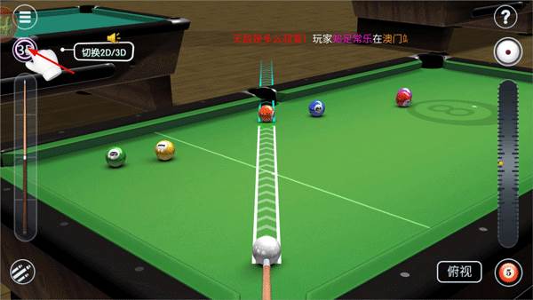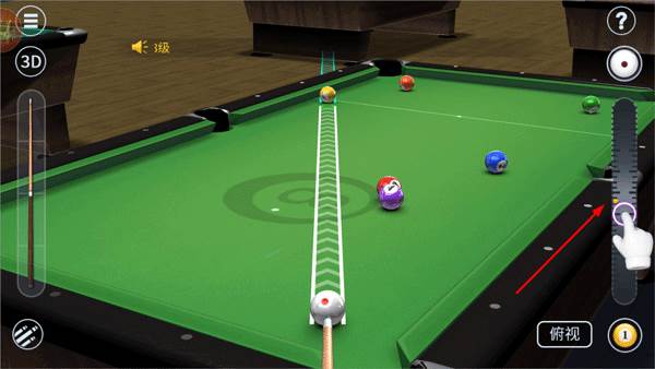 和电脑AI对战,有标准的8球和9球规则,触摸屏幕来调整方向,拖拽右边的力度条,松开击球。